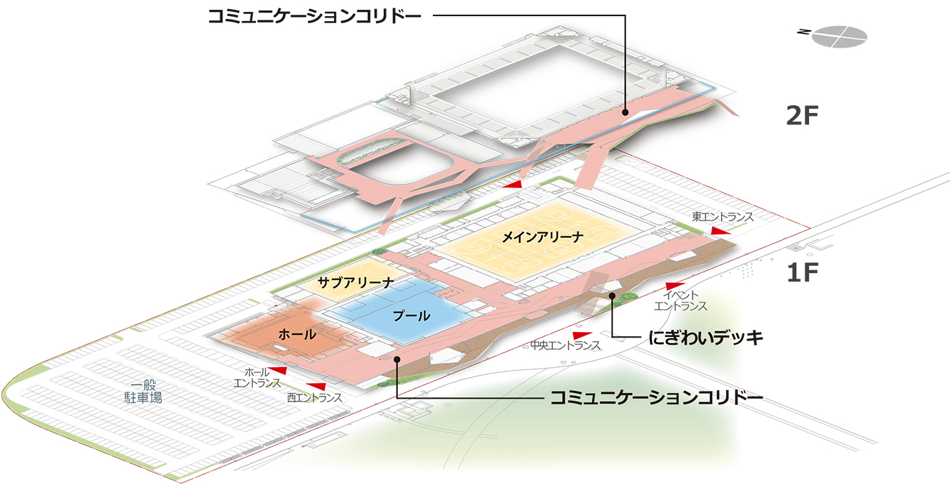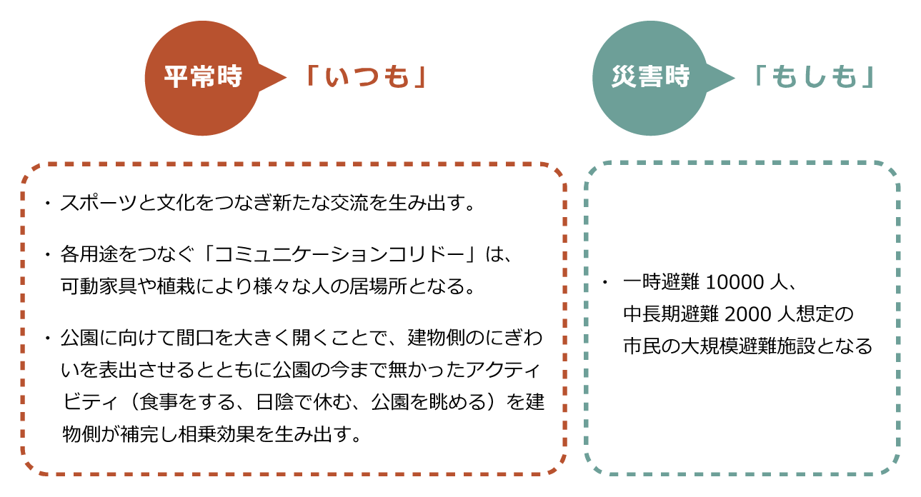 スポーツ系施設のアリーナやプールと文化施設の音楽ホールが共存しているのは大きな特徴の一つとなっている。通常は閉鎖的な構成になることが多い両機能だが、本計画ではスポーツベット 着いたーーを介して施設内を見通せるようにすることで、それぞれの目的で来た人々がお互いの活動を感じ、交流が促されることを目指している。また災害時には、避難スペースの確保や、プールの水の雑用水への活用といった、人々が安心して過ごすための利用転換を考慮している。
