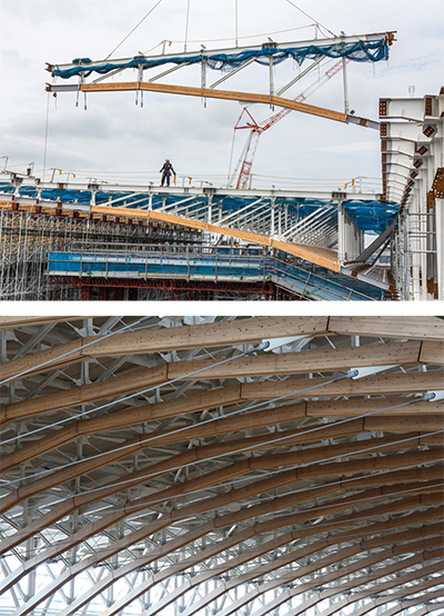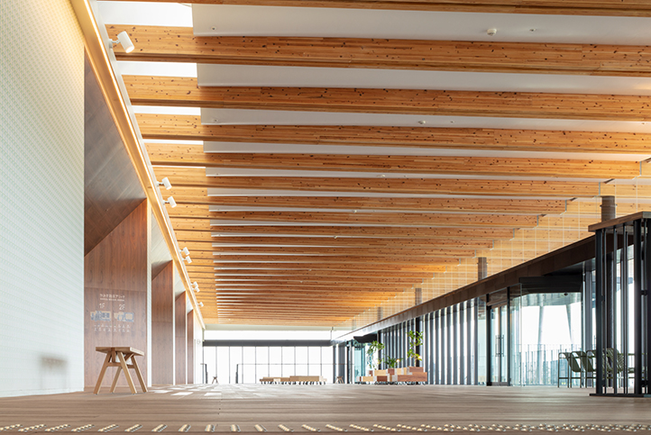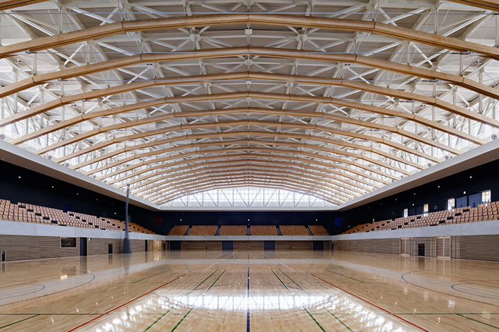 スポーツベット 着いたーーとアリーナの屋根には茨城県産材の杉と鉄骨のハイブリッド材を活用することにより、平常時、災害時ともに安心できる居場所作りを行っている。木材だけでは断面形状が大きくなってしまうところを、H鋼を木で挟みBOX形状とすることで剛性を向上させた木鋼ハイブリッド材とすることで、断面積を小さくしコストを抑えながら、大スパンの木質空間を実現している。