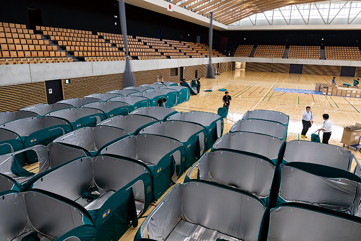 災害時のメインスポーツベット 着いたー:避難所用間仕切りが設置される