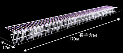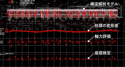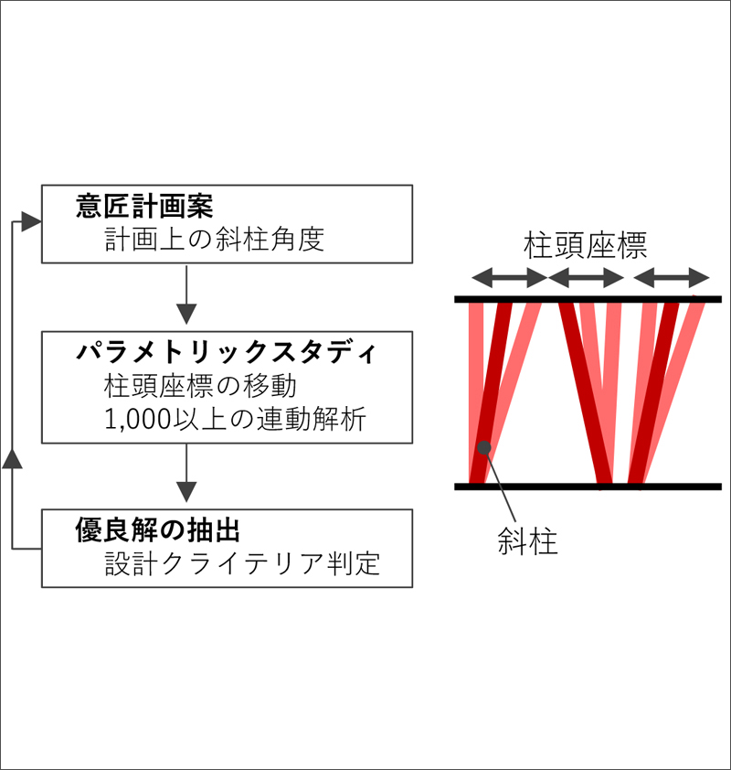 公園の木立をイメージした前面ファサードの斜め柱は恣意的な角度ではなく、構造解析ツールを活用し、構造の合理性を持った並びで構成した。ファサードが170mと長大であるため地震時に一部の斜め柱に応力が集中し、局所座屈が生じる危険性があった一方で、単一な斜め柱の角度では、意匠上好ましくないという条件の中で、アルゴリズムを活用して全58本の柱の挙動の合理化を図り、角度を決定した。