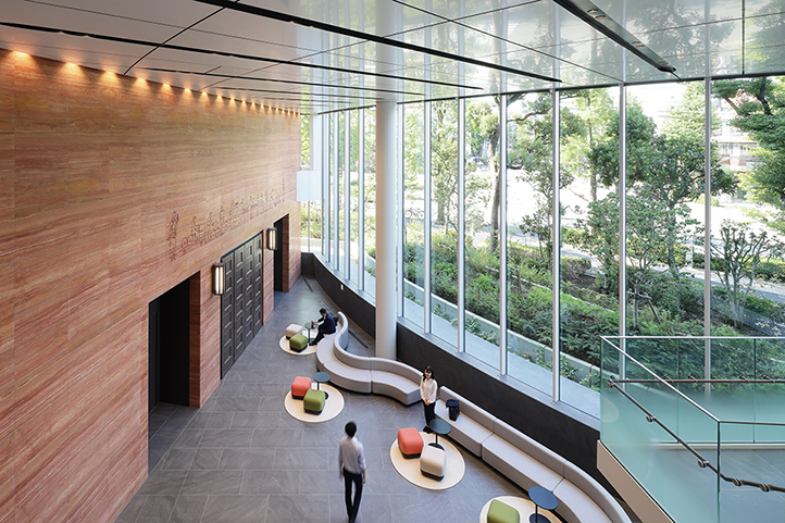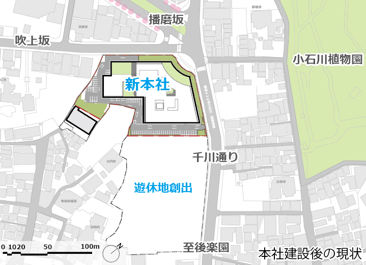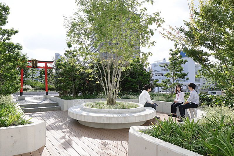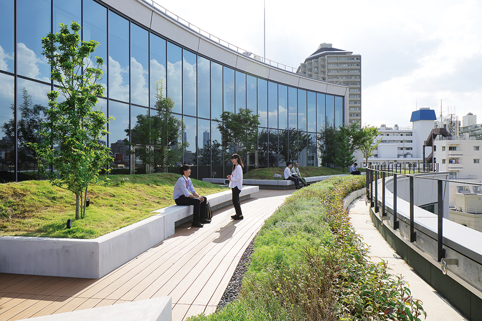 新本社の外部空間からは播磨坂や小石川植物園を望ことができ、都心部でありながら豊かな緑が残された大変貴重な環境であることを再認識させられる。それらの豊かな環境と連続するように、地上部と屋上部を合わせて敷地面積の15%以上という広大な緑地を創出する計画を行った。