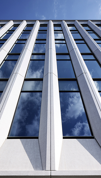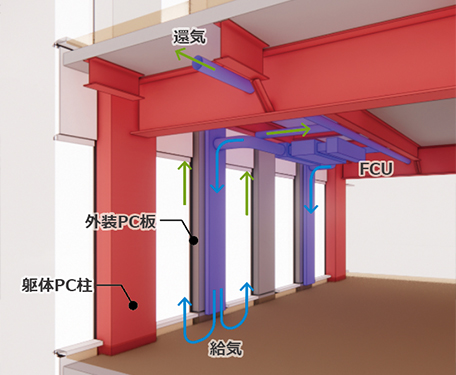 建築を覆う外装は、1.8mピッチに配置され、7.2mごとに鉛直荷重を支持する外殻柱「外装兼用PCa柱」で構成している。ガラス面までの奥行きを確保した台形形状のファサードは眺望を確保しつつ、外部からの熱負荷を効率的に低減。厚みの薄いPCCW(Precast Concrete Curtain Wall)の裏側スペースはダクトを立下げ、空調空気をブラインド外側の床下から吹く「簡易エアフローウィンドウシステム」によるペリメータレス化を図っている。