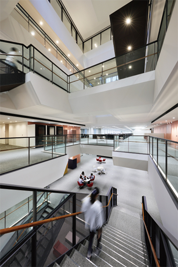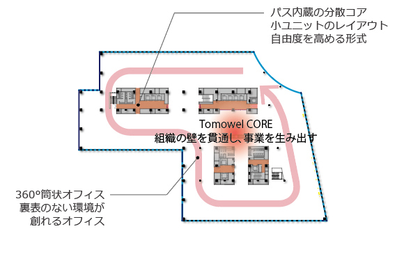 建物中央の空間は、コーポレートブランドである「TOMOWEL」(ともに良い関係を築く)という信念のもと、組織の壁を突き破り、多様なつながりを生み出す”CORE”となるよう計画。基準階は「パス内蔵分散コア」により、無駄な専有通路を最小化し、360°どこでも同様な環境の構築が可能なオフィス空間を実現している。