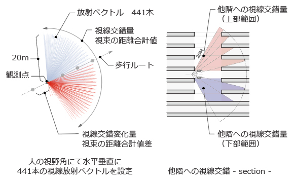 コアとなる空間は、互いがよく見えるだけではなく、より変化に富むことに価値があると考え、デジタルデザインにて視線交錯量とその変化量を算出し、補足的に効果の検証を行った。