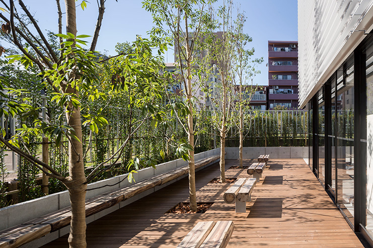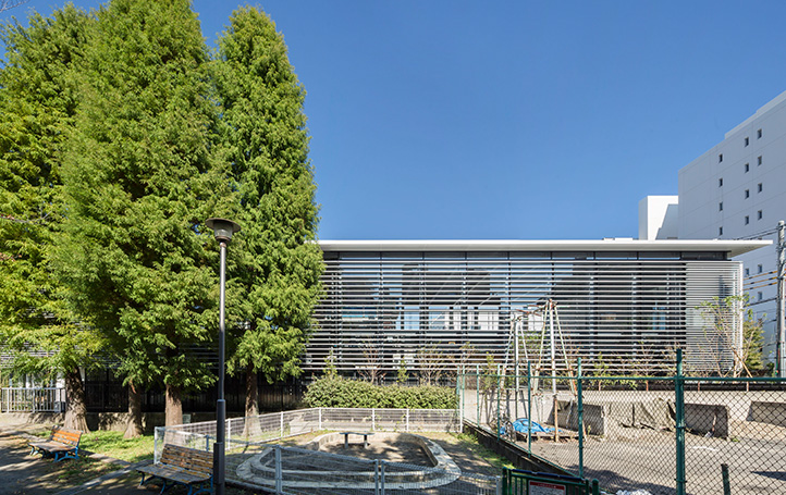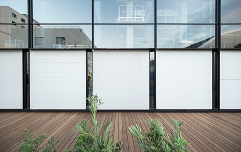 実物を見て学習できるよう、使用頻度の高い代表的な外装材料を5種類使用している。内部からは取付方法のディテールの確認が可能。