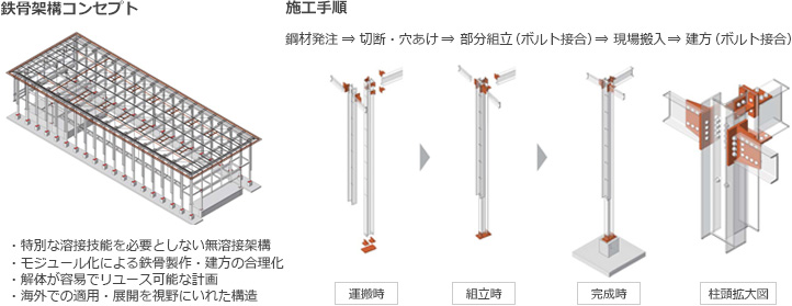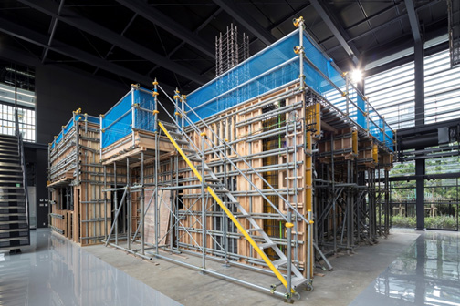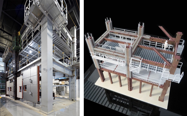「鉄骨・外装モックアップ」にはBOX柱、コラム柱、SRC柱などの様々な鉄骨構法を再現している。あわせて鉄骨仮設やそのピースも再現し、鉄骨構造に対する理解を深めてもらう。