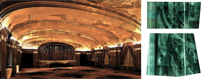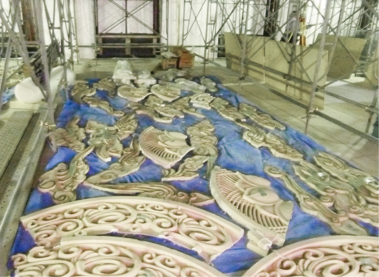 生かし取りした石膏レリーフ。すべてのパーツを慎重に取外し、裏打ち補強・補修をした後に再取付。