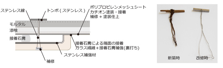 生かし取りしたレリーフは補強・補修した後、当時と同じように石膏接着およびトンボを用いて留め付け、復旧する。現代の最先端の素材を使用しているが、取付工法は当時と同じ考え方を継承している。