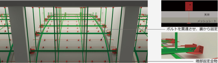 部固定金物により天井を周辺躯体と一体化。メッシュシートと貫通ボルトにより天井を一体化すると同時にワイヤーにより落下に対するフェイルセーフを図っている(特許出願中)。BIMを活用し、全スパンにわたって補強位置を事前に検証した。