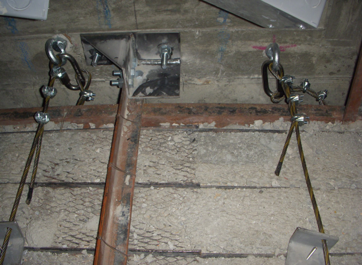 天井内の端部固定金物、補強ワイヤーとアングルピース。