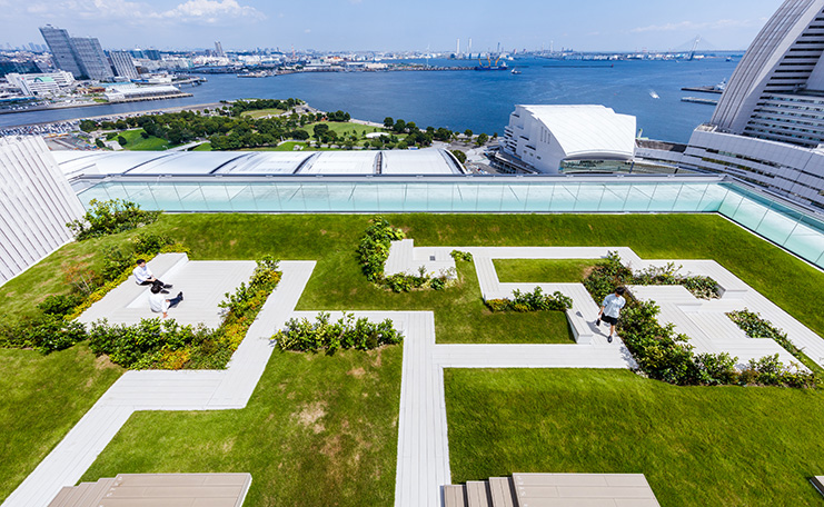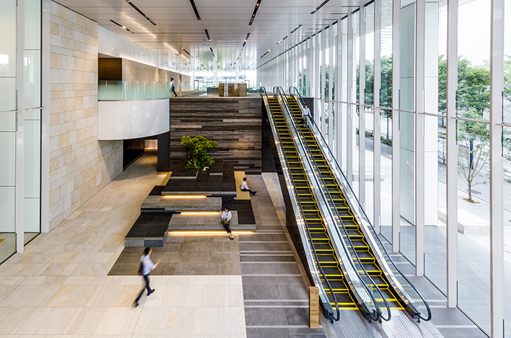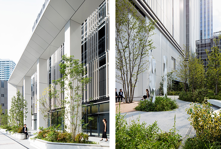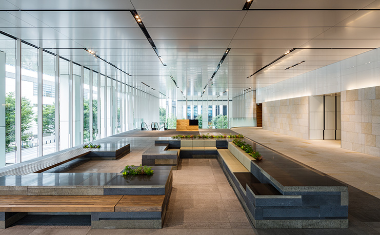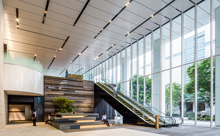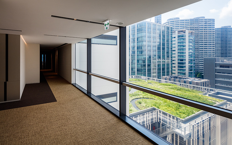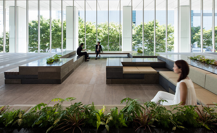 自然の揺らぎを感じる空間は、ワーカーの居場所・コミュニケーションの場として、回遊と佇む、想い想いに対応するデザインとしています。オフィスや、周囲のビルやマンションから望む駐車場の屋上は、視る庭園として、人・街に潤いを提供します。