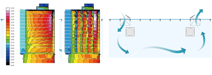 2種類の庇の組合せにより、歩行空間の風環境を向上させる(約5%の向上)