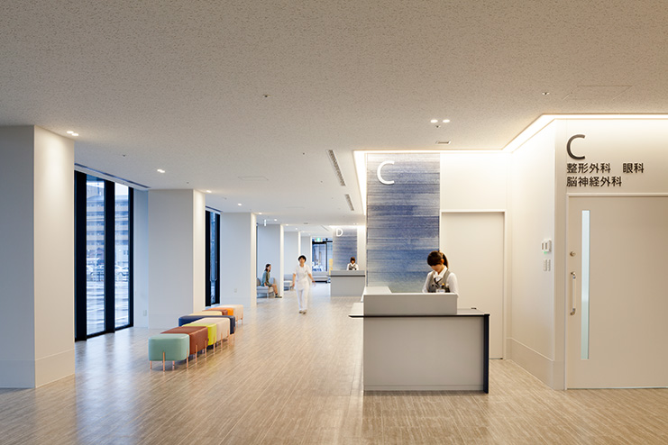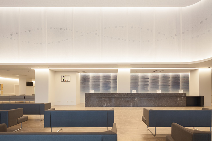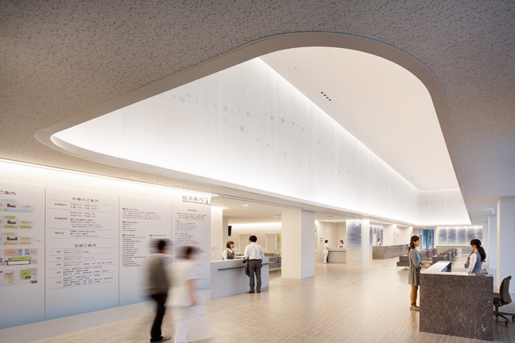 外来の壁と天井の際にある照明は、近年駅などにぶら下がる光る薄い板状のサイン板(導光板照明)を応用し、間接照明に代えて天井に設置し、掘込がなく施工性のよい照明器具を開発した。色温度・光源の強さ・照明照射方向をすべて今回の空間に適したものとし、自然光との組み合わせで患者にやさしい光環境を提供した。