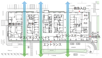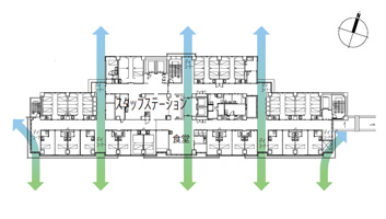 病棟フロア 山から海へ抜ける空間構成 建物の待合やデイルームを南北に配置、地域とつながり地域を感じる空間づくり