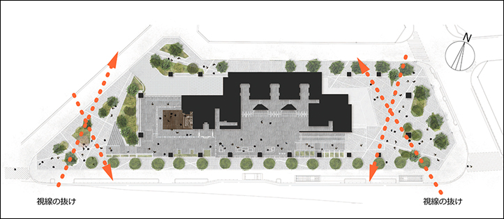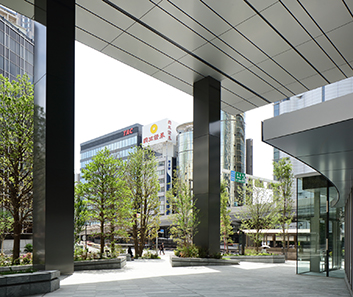 東側広場:緑で囲まれた天井高さ14mの大きなピロティ空間が、拡がりのあるオープンスペースを地域に提供しています