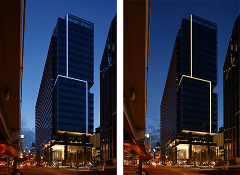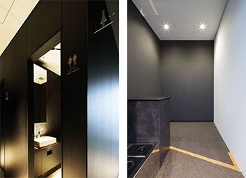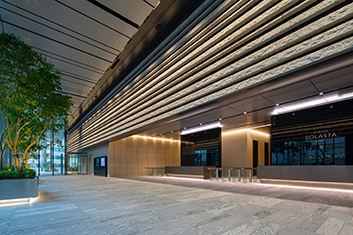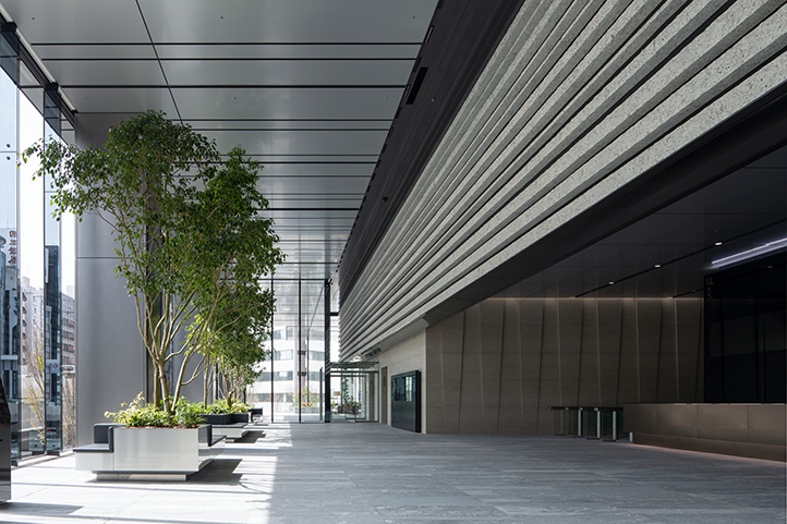 エントランスホールは、存在感のある石の下り壁によりゆるやかに空間を分節し、明るいエントランスから、落ち着きと品格のあるエレベーターホールへと人々を導きます。 また、人の生体リズムを考慮した調色調光システム「サーカディアン照明」を導入し、時間変化に応じ空間の雰囲気が変化します。