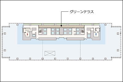 基準階グリーンテラス:コアを内側に入れ、各階で外の空気を感じることのできるグリーンテラスを提供