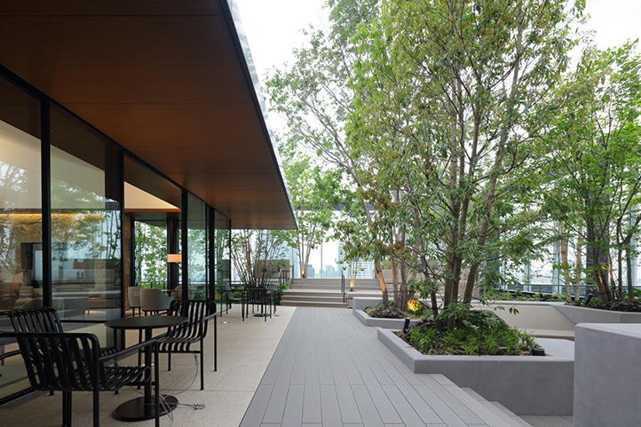 21階「スカイテラス」:木陰のもとに居場所を点在させ、人々に居心地の良い場所を提供します