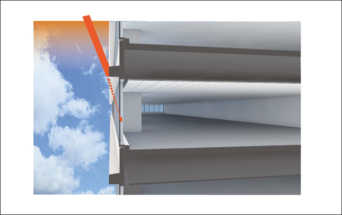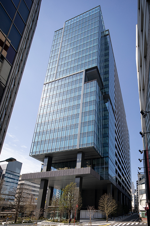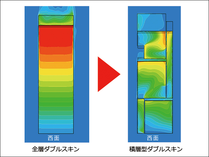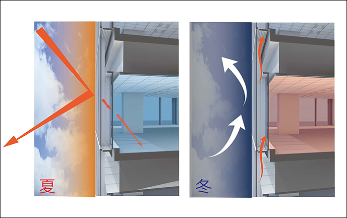環境負荷や立地条件など各方位の特性に対応した外装計画。 南面は庇により日射負荷を低減しています。 熱負荷の高い東西面はダブルスキンを採用。 ダブルスキンは、スリットを設け、分割・積層することにより省エネルギー効率を上げるとともに、複数層ごとに分節したガラスボリュームの積層。 CASBEE(建築環境総合性能評価システム)Sランク(最高評価)を公的認証取得しています。