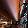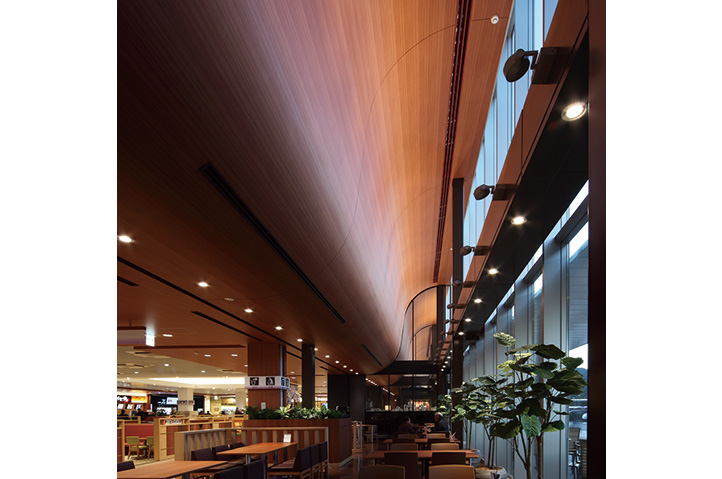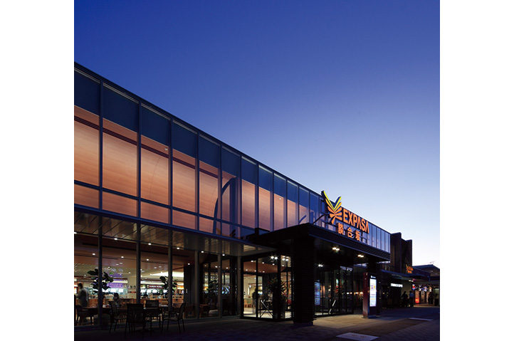 商業複合施設を収容したサービスエリアのリニューアル。今や旅の目的地のひとつとなったサービスエリアとしてのアイデンティティを高めるデザインとした。幅45mのS字カーブを描く木調の下り天井は、内と外を緩やかにつなげ人々を迎え入れる。日差しを柔らかく取入れ省エネルギー化も図り、夜間は間接照明の暖かい光が、訪れる人々のこころを和ませる。
