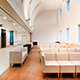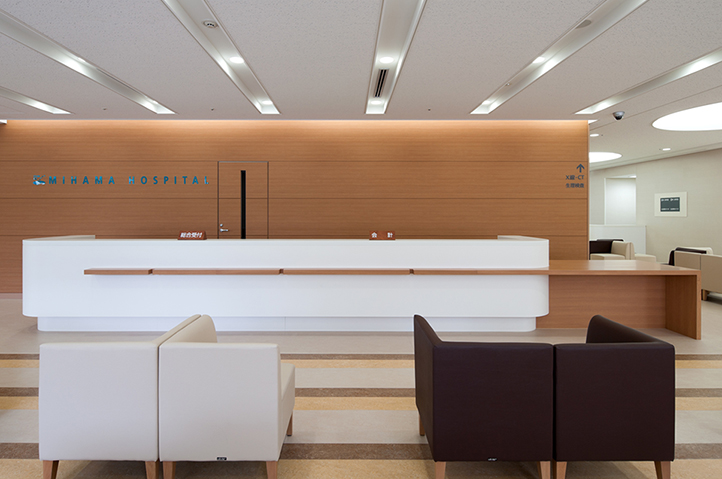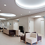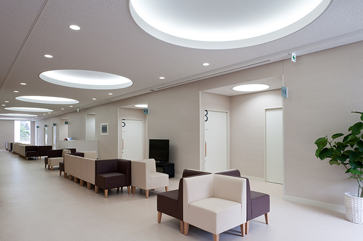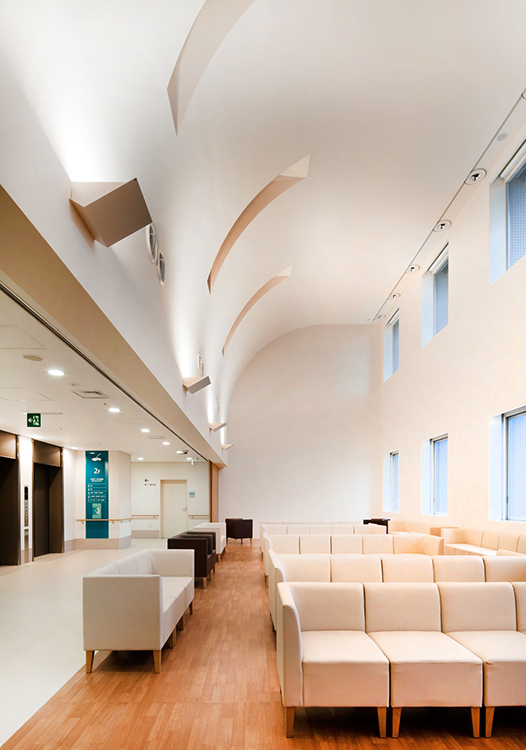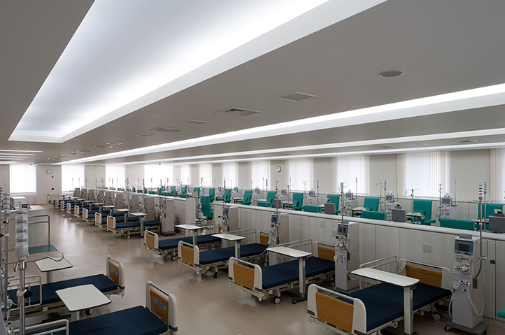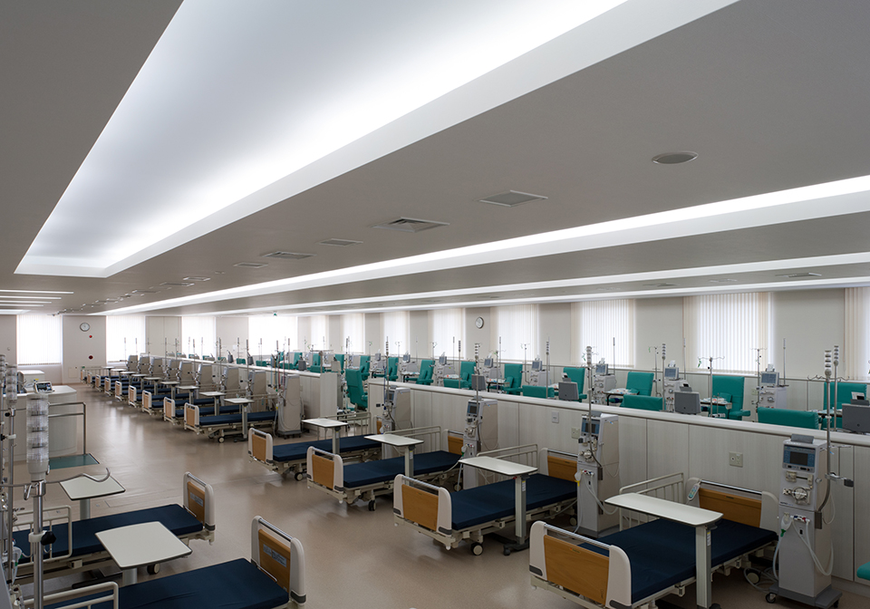 血液透析と泌尿器科の専門病院である。配置は病院棟と駐車場棟の間に出入口とロータリーを設け、来院患者のプライバシーと将来の建替えに配慮している。2階の透析室はRCと鉄骨造を組み合わせた当社のHy-ECOS 構法により、約15×30Mの見とおしのよい無柱空間を実現している。週3回、4~6時間ベッドで過ごす患者のために、直接光を避けた間接照明やドラフトを感じない設備配置により快適な治療環境としている。透析患者待合は吹き抜けのラウンジとし、長期間の通院を要する日常にやわらかい光の変化がくつろぎの時間を与えている。3階にはブース型の夜間長時間透析や個人用透析を配置し、専用のラウンジやシャワールーム等の充実により、ライフスタイルの維持や社会復帰の支援体制を整えている。