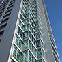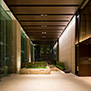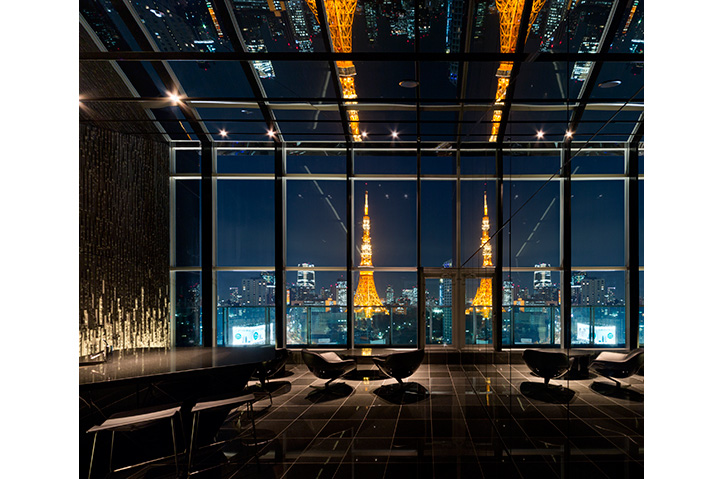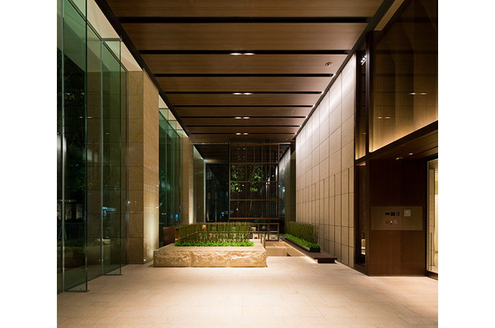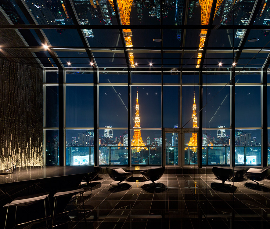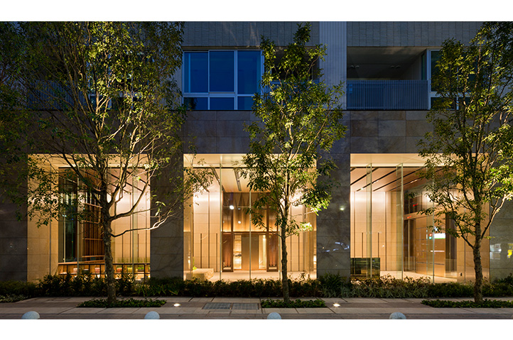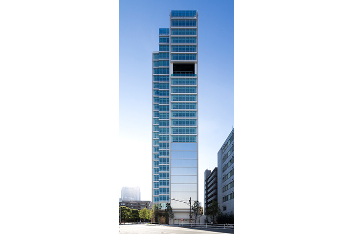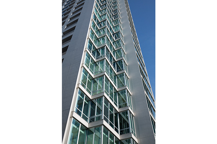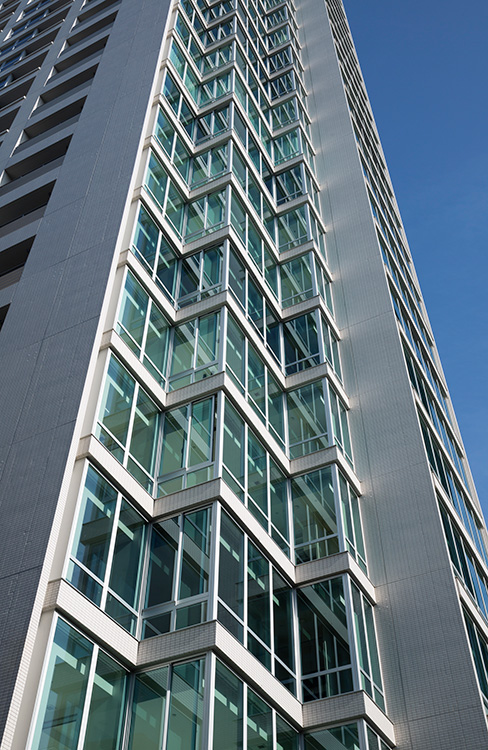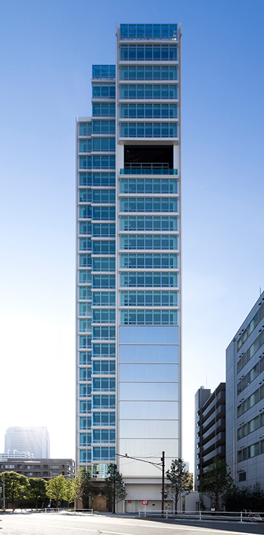 緑豊かな芝公園に面し、東京タワーを直近に臨む眺望に恵まれた立地。大きく開いた開口部は、眺望のよさを端的に表現している。敷地形状から、雁行型プランにより生まれるコーナー部を、細く伸びやかなファサードデザインに利用した。上層階には、眺望を共有できる2層吹抜けのビューラウンジを設け、均質なファサードに特徴を与え、このマンションを象徴するデザインとした。