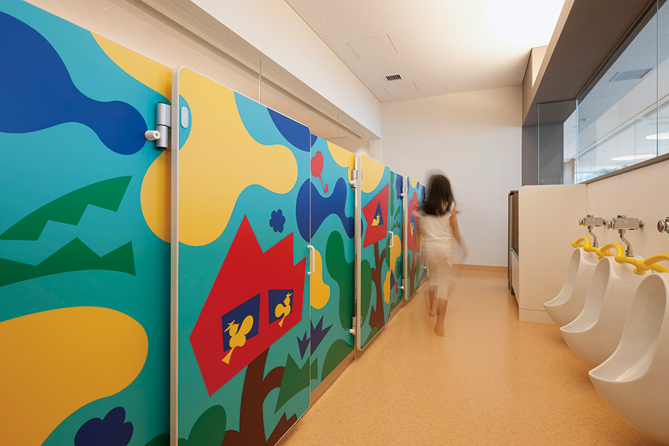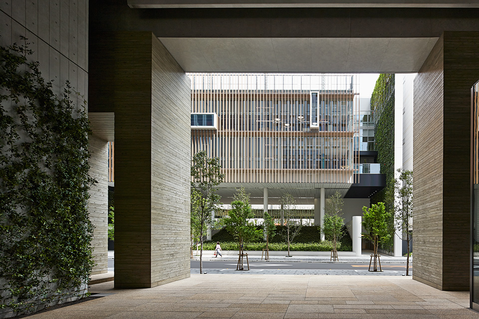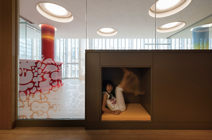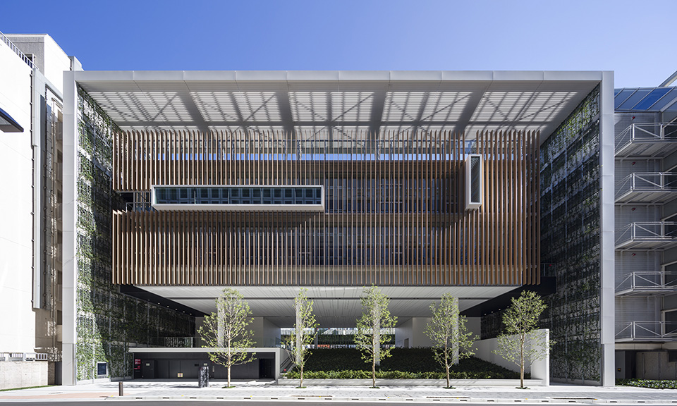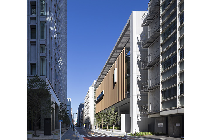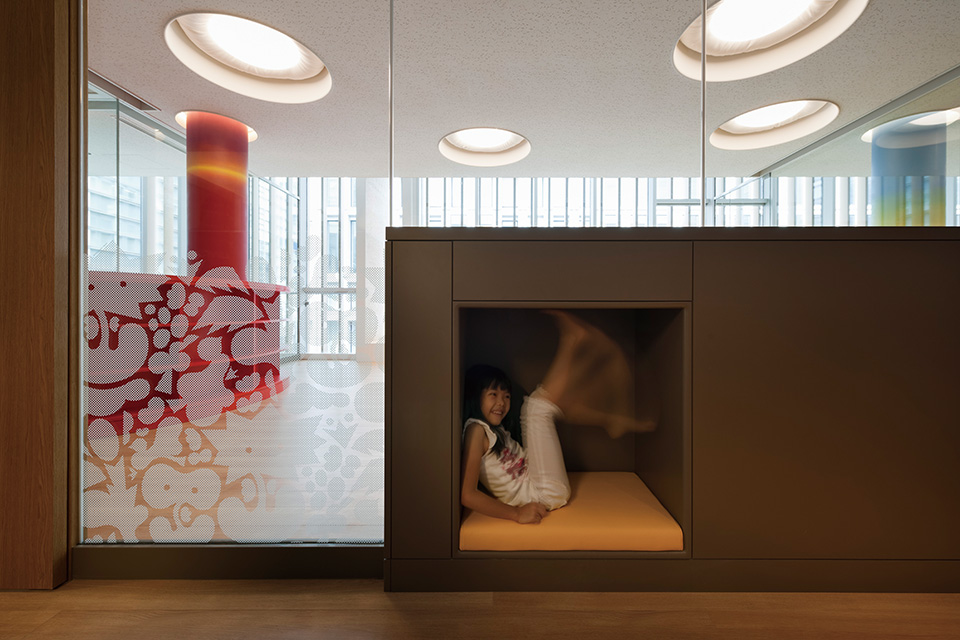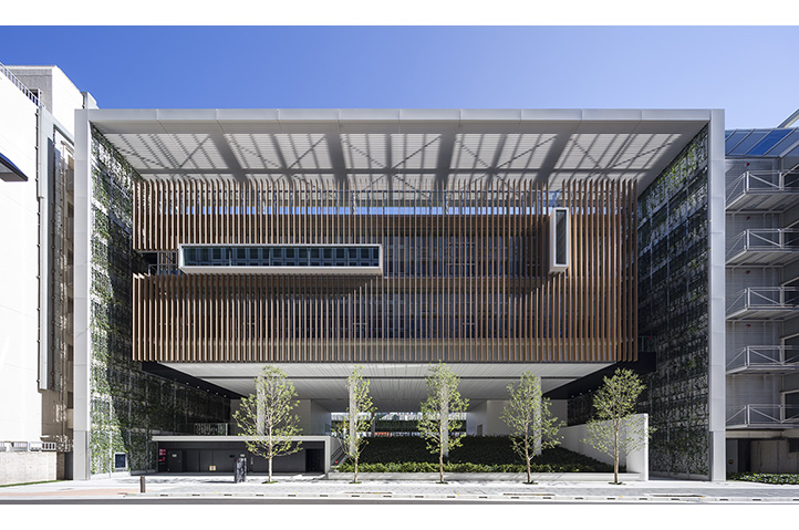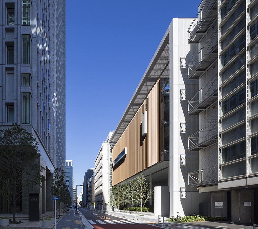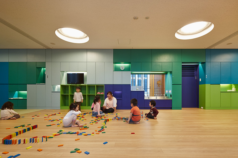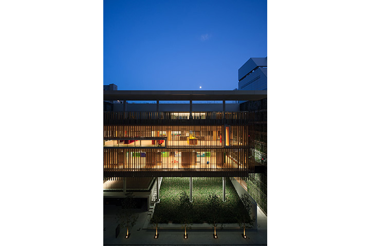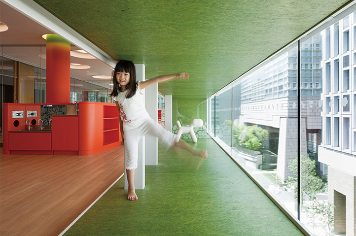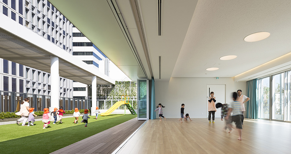 保育所と幼稚園の機能を一体的に提供し、子育て支援事業を行なう施設。都市再生特区の社会貢献施設として計画され、防災広場や防災備蓄倉庫等を設置し地域の防災拠点ともなっている。大規模な壁面緑化やピロティ斜面緑化により、緑の少ないビジネス街でも子どもたちが緑を感じられる環境と、潤いのある街並みを提供しつつ、子どもたちの五感を刺激しながら楽しく過ごせる空間づくりを行なった。