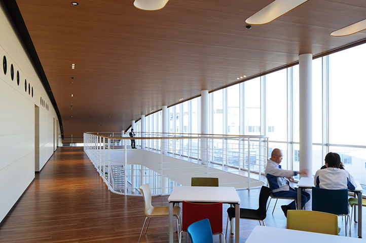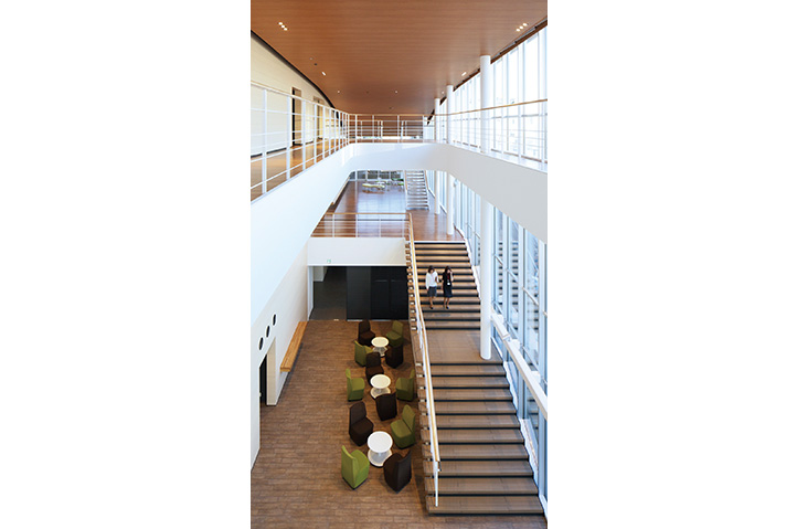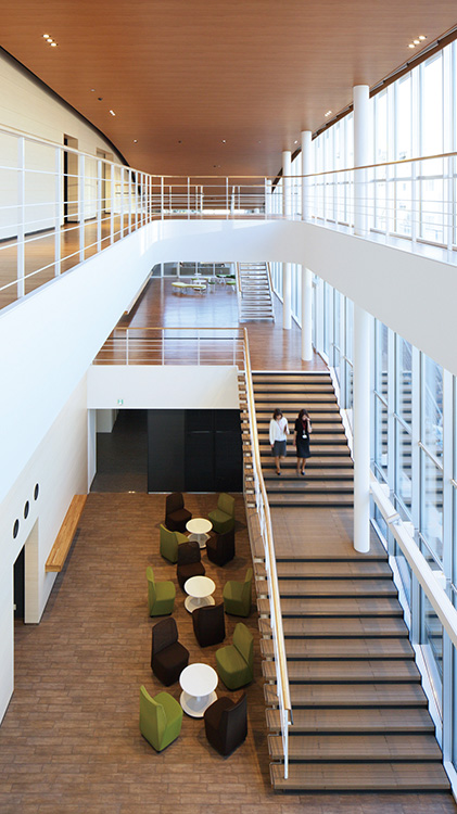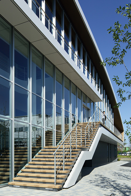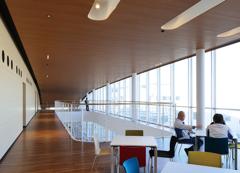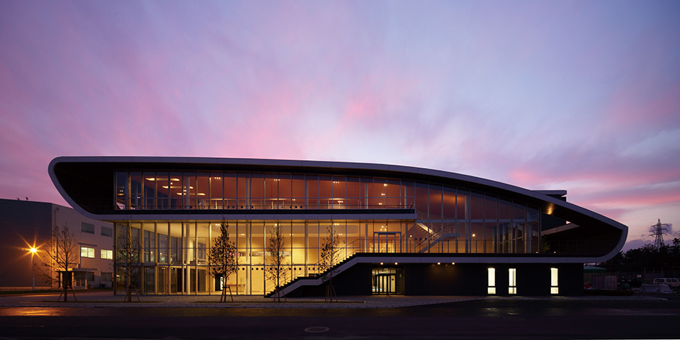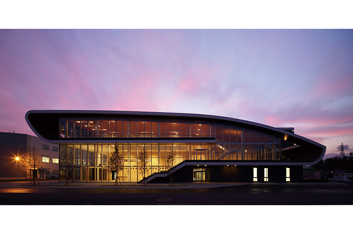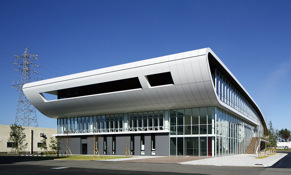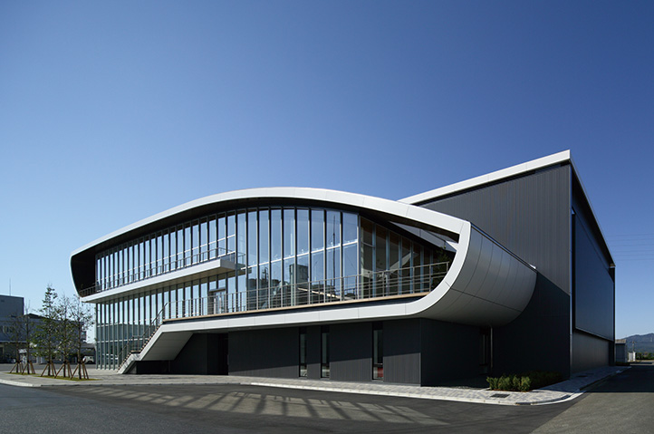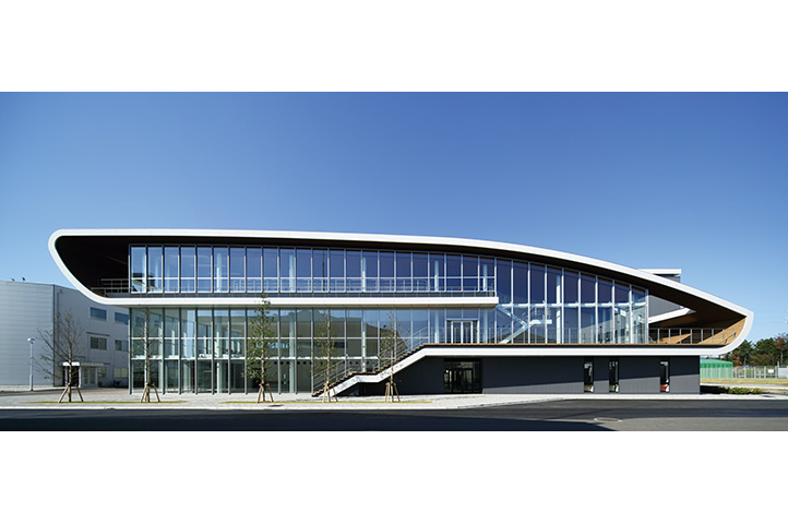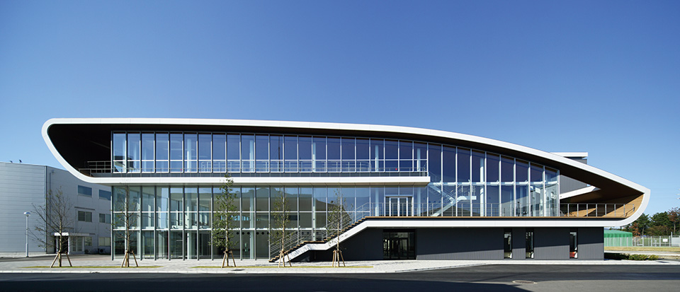 製薬会社の開発拠点を担う事業場の厚生施設兼スタッフ施設。ものづくりの中枢を担う従業員のケアとモチベーション向上に寄与すると同時に、企業のグローバル試行を表象する建築を目指した。3層にわたる施設構成を、プランでは徹底した合理性を追求しつつ、立体としての建築はのびやかな曲線による構成とし、世界に飛翔するダイナミズムを表現した。