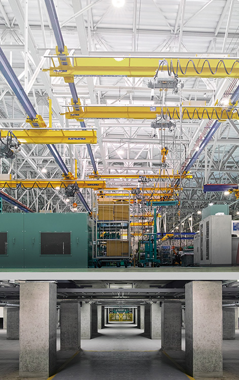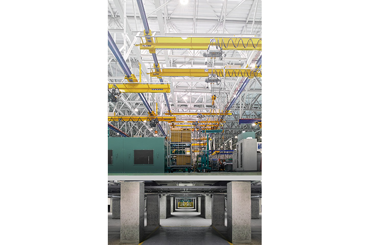 「50年後を見据えたダントツ工場」という発注者ニーズに斬新な発想で応えた施設。全面地下ピットと取外し可能なPC床板により、「工場床のOAフロア化」を図り、設備機器をピット内に収納することで生産エリアを拡大し、製造ラインの組換えに対し最大限の柔軟性を確保した。また、恵まれた自然環境を生かし、自然エネルギーを最大限に取り入れ、従来工場に比べ大幅な省エネルギー化を実現した。