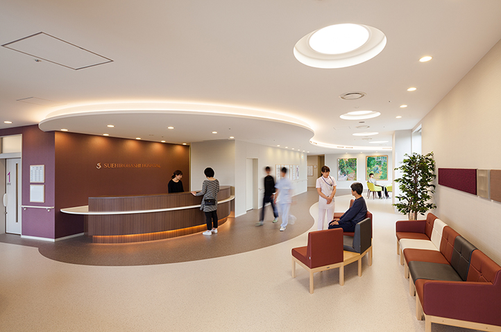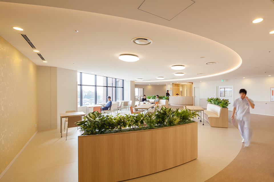 - ・外来/病棟とも大きな開口を設け、自然光をたっぷり取りこむことで、病院/施設といった印象を軽減し、自分の家で日常を過ごす感覚でいられる空間とした。