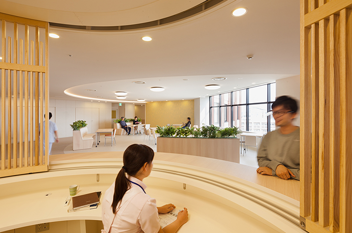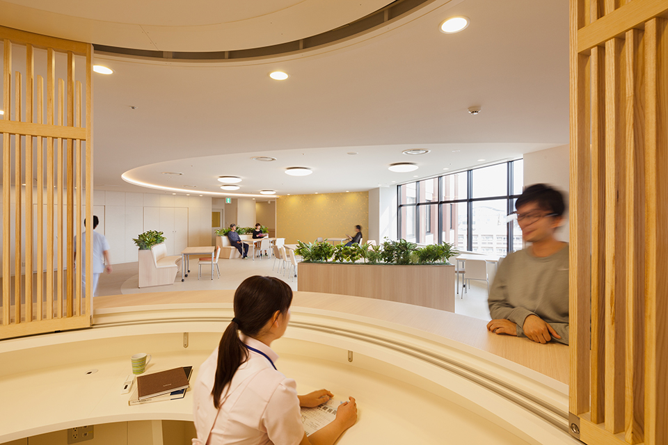 - ・スタッフステーションをオープンカウンターとすることで患者とスタッフのコミュニケーションを促し、「こころの回復」に寄与した。