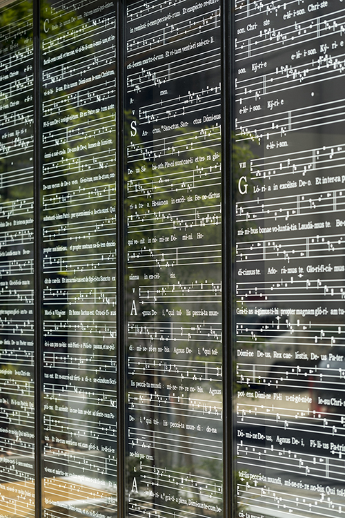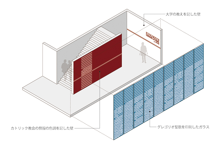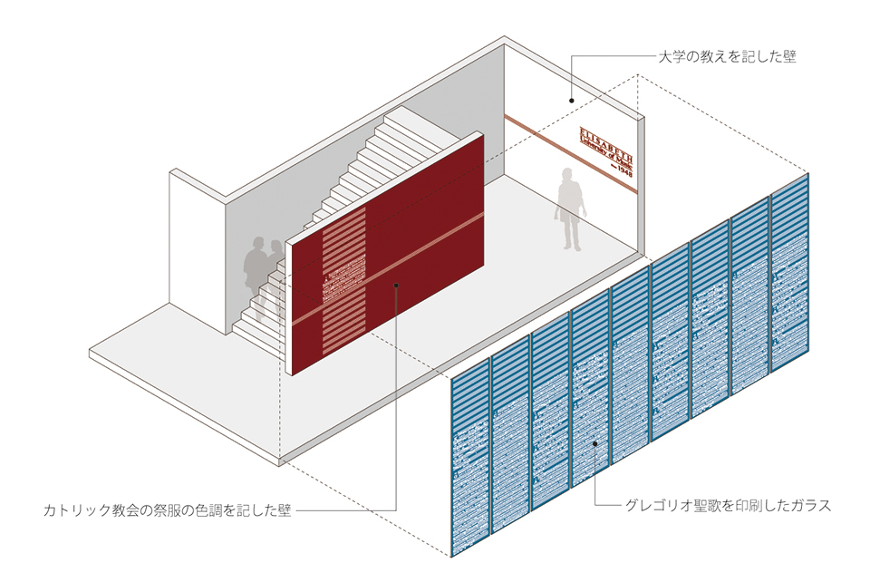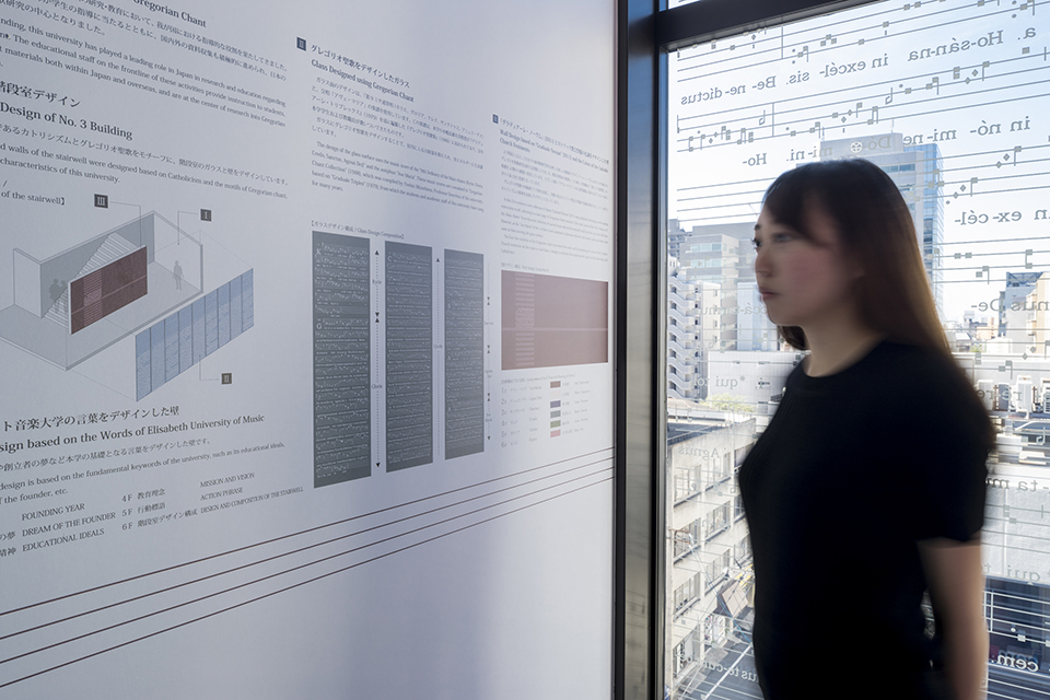 スポーツベット 予想は、焦土と化した広島でベルギー人神父ゴーセンスが昭和22年に開設した小さな音楽塾を起源とする。建築はカトリシズム(=普遍性)の精神に基づき、生徒一人ひとりを大切に教育する場として、また音楽による地域文化向上への貢献を目指した。 建築の特徴は、スポーツベット 予想ならではの表現を用いたガラスのファサードと、そこに面する動線空間にある。ガラスには大学が創設以来、研究・教育を続けてきた「グレゴリオ聖歌」の特徴的な楽譜を全面に施した。背後の壁面には、カトリック教会の祭服6色を各階に配し、行動標語「音楽をとおして 私が変わり 世界を良くする人になる」をはじめ、教育理念や大学の教えを示した。
