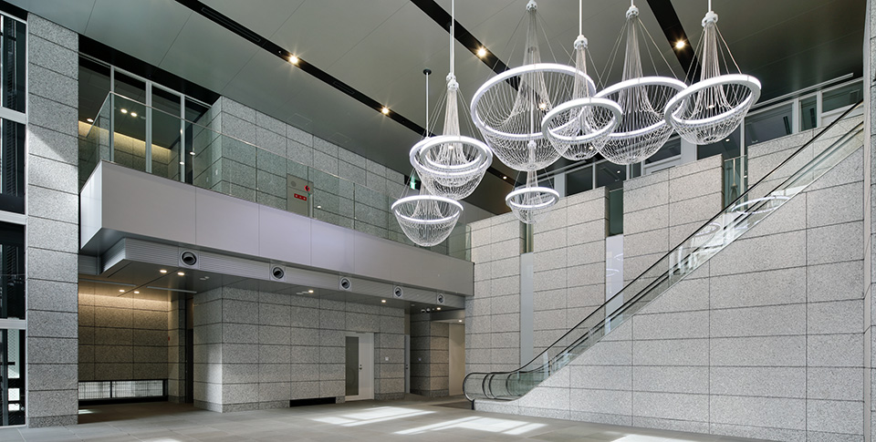 眼科薬のパイオニアであるスポーツ ベット おすすめの本社ビル。 オフィスデザインのキーテーマは、執務エリア内でのコミュニケージョンを最大化することである。執務空間は、5層にわたるボイドにより上下に連続し、オープン階段でつながっている。ワーカーの空間・動線・視線が階や部門を超えて交わり、コミュニケーションを誘発している。眼科薬に因み、泪(なみだ)をモチーフとして各所のデザインを行い、水のもつ連続感や潤いを各所にちりばめた。しずくをイメージさせるエントランス照明、建物と一体感のある水景、空間に潤いを与える屋上庭園や中庭など設えられている。一方、ファサードは、垂直に伸びる彫の深い石柱により、端正で重厚な印象を醸し出す。奥行きのある石柱は充分な採光と西日の抑制を両立している。またデシカント空調を採用し、快適な空調環境とエネルギー消費の抑制を図っている。