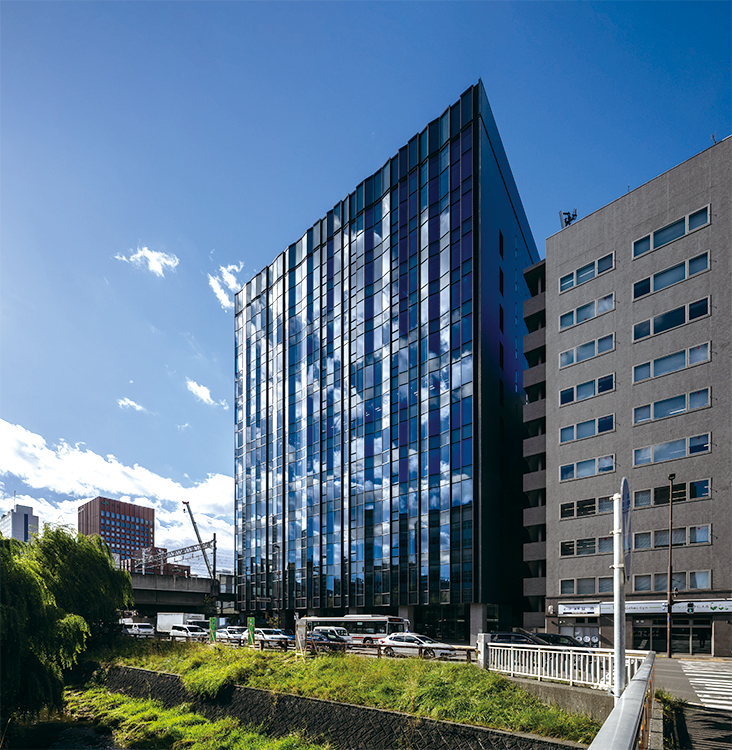 札幌開拓時の用水路を前身とする創成川に近接し、それと直行するJRの線路敷に隣接する敷地に建つ札幌駅至近のスポーツベット 税金ビルである。寒冷地を想起させる雪や氷のきらめきをモチーフとした外観は、ランダムに雁行したガラス面が方位の異なる光を映し込み、時間や天候などの変化を建築に与えている。また見る場所により異なる表情となっている。南面は断熱カーテンウォールとインナーサッシュの組合せにより、断熱・防火・防音性能を同時に満たしている。エントランスホールは木調ルーバーを効果的に配置し、空間の広がりを感じさせながら暖かみのある色調で利用者を出迎えるデザインとした。1階ピロティには歩行者向けのオープンスペースを提供し、札幌市の取組む地上歩行者ネットワークと連携することで札幌駅周辺の賑わい創出に寄与している。