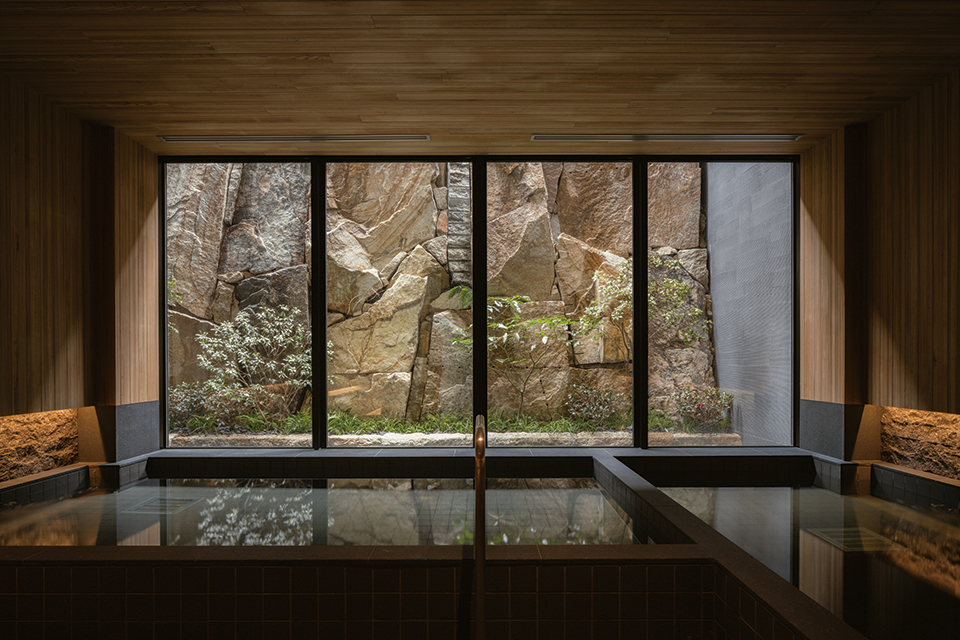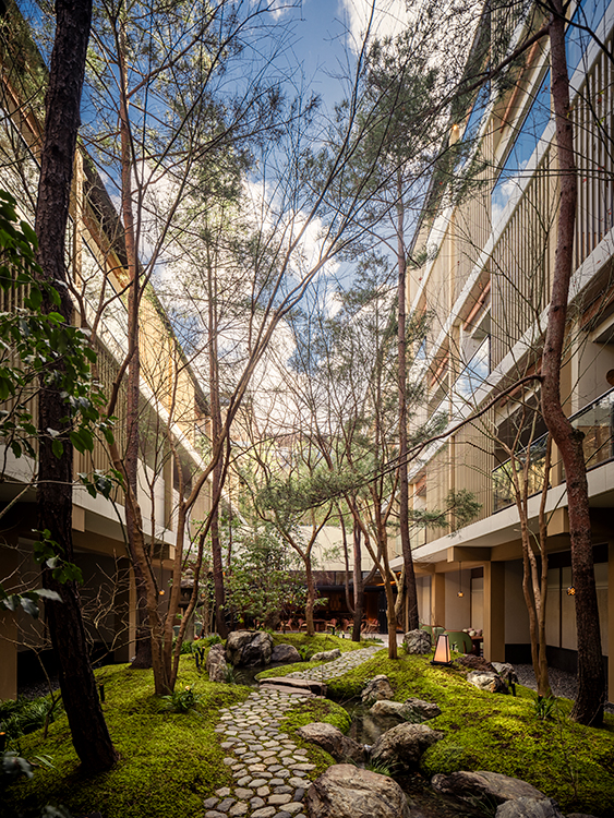 Six Sesnes Kyotoはウェルネスとサスティナビリティを軸とする自然派ホテルである。日本建築が備える内外の流動性は、自然の移ろいを愛でる日本人の価値の見立て方を空間として顕在化させたものである。外を内に取り込むことで自然と交歓し、五感を通して心地よいと感じる空間。建築がそうした日本人の感性を体感できる鋪設(しつらい)を持つ事で、ホテルの理念との一貫性を持たせた。東山の麓、奥長で高低差のある独特の敷地形状。囲い型の配棟で客室が短辺で向かい合う。隅入りのロビーからは奥に深い中庭が広がる。この「狭隘さ」と「奥行き」をどう建築の豊かさに変換できるかが最大のテーマとなった。短手には縁側バルコニー、縦格子、赤松を配し、多層結界による奥行感の増幅を期待した。長手に向くロビーは、中庭の奥行き・高低差を活かし、野趣溢れる赤松群が遠景となる作為を施す事で、スポーツベット 入金不要らしい奥深さを獲得した。「狭隘さ」を「豊かさ」に変える伝統的な暮らしの知恵を引き継いだ。ラグジュアリーという価値観が物質的なものから精神的なものへと転換される先駆的なホテル建築である。