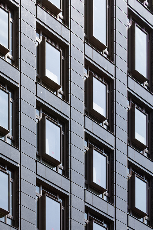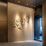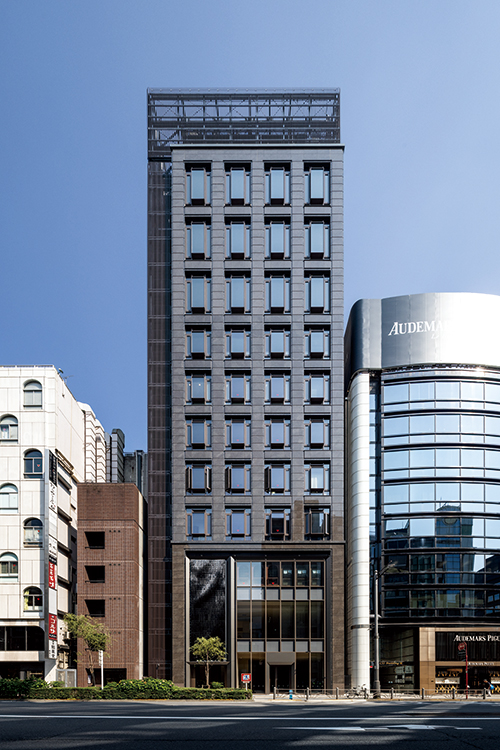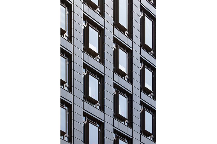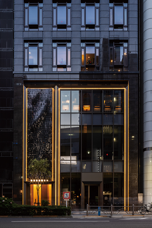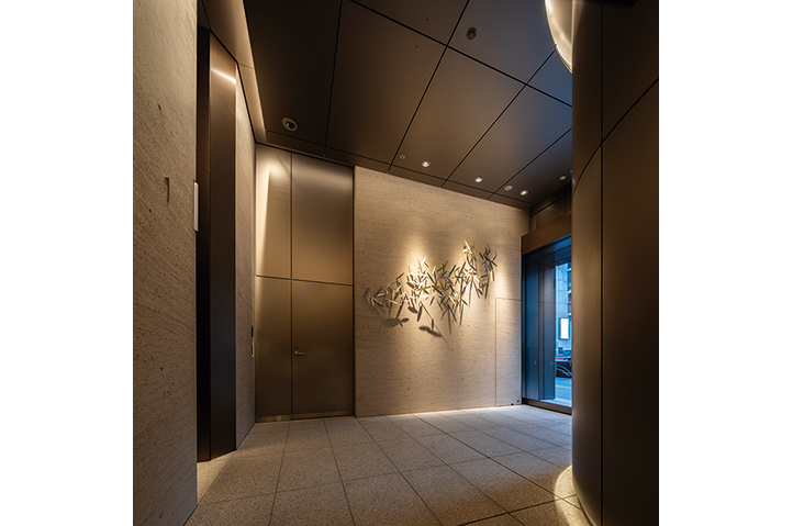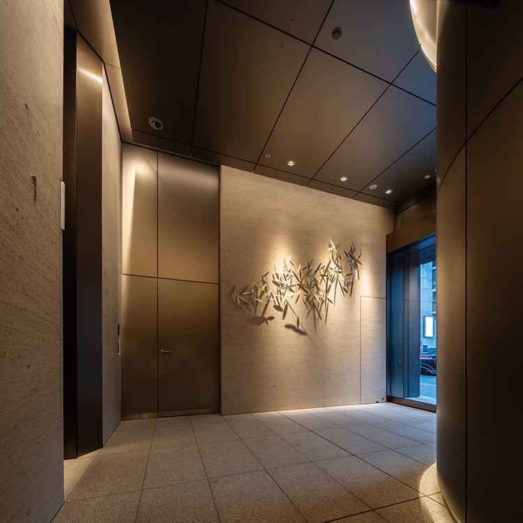 スポーツベットとは6丁目、外堀通りとソニー通りに面する飲食テナントビルの建替計画。様々な外観デザインが溢れるスポーツベットとはにおいて、クラシカルでエレガントそして永く愛される建物を創ることがテ-マであった。花崗岩打込みPC版とステンレスサッシで構成し色調をブラウン系でまとめることで、彫りが深くクラシカルでエレガントな外観を実現した。またステンレスサッシはアフターコロナにおける建物価値向上を意図し、自然通風が可能な形状としている。外堀通りの植樹である「柳」をモチーフとしたアート作品を設置した低層部は、そこに反射する光・街路の写り込みが時間とともに変化し、スポーツベットとはの華やかな景観の一部となっている。エントランスは大理石と金属パネルの構成とし、外観と同じ「柳」をモチーフとしたアートを設置、スポーツベットとはの高級感と場所性を表現した。スポーツベットとはに建つソシアルビルとしてテナントと共に末永く愛される建物となることを期待したい。