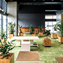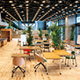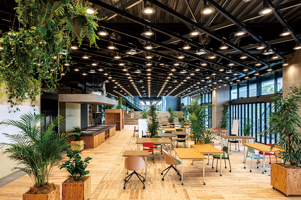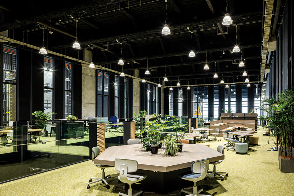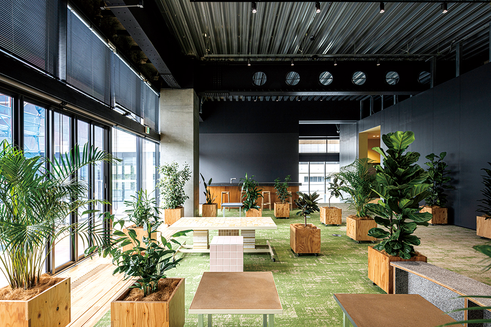 拠点の中心機能を果たし、施設全体をつなぐ幹となるスポーツベット 確実 Hubは、イノベーションを起こすためのDDRSプロセスを落とし込んだ空間構成とした。また常に変化し続けるプログラムに柔軟に対応可能なシステムや環境計画、新技術を導入し、イノベーションを推進させる新たな創造の場を実現している。アップデート可能でオンゴーイングでフレキシブルな空間とするため、必要なシャフト、機械室は窓際に集約し、トイレを含めた水回りや個室空間はボックスインボックス状に配置し可変にしている。自己効力感を高める環境の実現を目指し働き方に応じて場所を選択できる計画としており、目的に応じて利用できる個室や、仕事もできるバルコニーを設けている。オフィスの家具や植栽はすべて移動可能となっており、3階オフィスの椅子はWELL認証ながら、すべて異なる椅子となっていて、ユーザー個人が環境を選び、変えることが可能である。