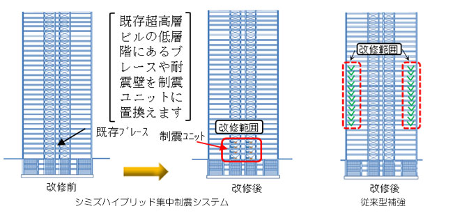- 制震装置設置範囲がパブリック用途の多い低層階に限定でき、基準階は設置不要です。
