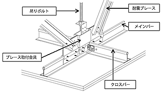長尺のメインバー(3,420mm)と短尺のクロスバー(910mm)の2種類の資材を組み合わせて構築する格子状の下地材で、一つの格子の大きさは910mm×455mmです。吊元の上階の躯体からメインバーを吊り下げ、その両脇からクロスバーを差し込むと、特殊加工を施しているクロスバーの端部同士ががっちり噛み合い、脱着できなくなる仕組みになっています。