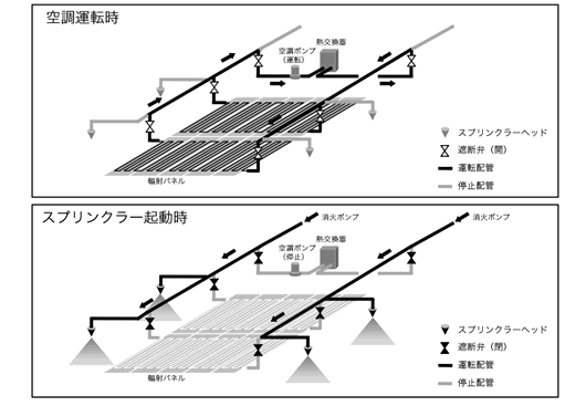 上図:空調運転時の冷温水の流れ。スポーツベット twitterパネルに冷温水が供給されているが、スプリンクラーヘッドには供給されていない。下図:スプリンクラー起動時は、遮断弁が自動的に閉じてスポーツベット twitterパネルへの冷温水の供給が止まり、スプリンクラーヘッドに消化ポンプから水が供給される。