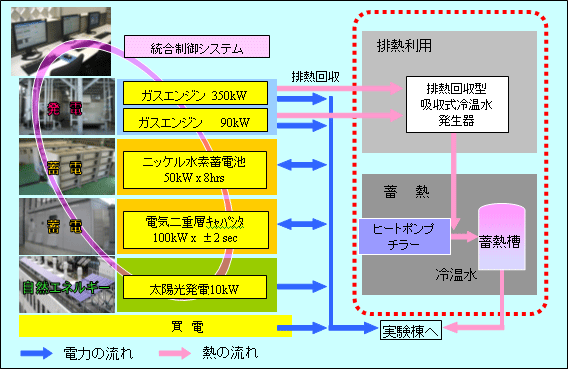 2006年8月に実用運転を開始したマイクログリッドは総出力600kW級で、標準家庭で約200世帯分の電力需要に相当します。電源構成は主力発電設備2機と蓄電設備2機です。主力電源には天然ガスを利用するガスエンジンコージェネレーションを採用し、急激な負荷変動にはニッケル水素電池と電気二重層キャパシタを協調制御します。さらに太陽光発電を設備し、自然エネルギーも活用しています。これら設備を非常に短い時間刻みで、需給バランスを取りながら運転することによって、安定した電力/熱を各実験棟に供給しています。