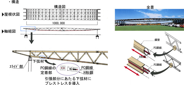 プレストレスを導入した鉄骨トラスで屋根や床を支えることにより、スパン100m以上の無柱空間(大空間)を構築する構工法です。