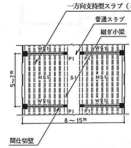 - 適用できる建物の規模は、中高層(8~14階程度)で、スパン梁間方向が8~15m、桁行方向が5~7m。