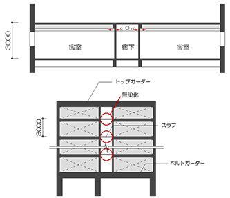ホテルなどの中スポーツベット サッカー 夏形式の建物の中スポーツベット サッカー 夏部分の両側に間柱を設置することにより、スポーツベット サッカー 夏上部の梁を無くし、スラブだけでつなぐ構工法。梁を無くすことにより梁下を通していた設備配管等のレベルが高くなり、階高を低減できます。