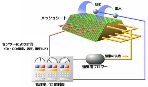 - 微生物活動に必要な栄養塩と水分は、散水により供給します。
