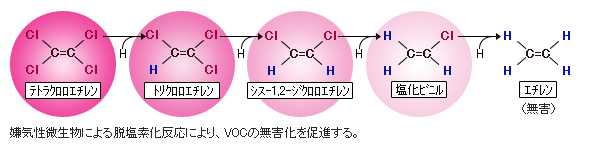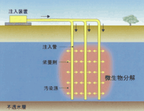 中~低濃度の揮発性有機化合物(VOC)や油に汚染された土壌、地下水に対し、栄養剤を注入することによって、地盤中の微生物を活性化させ、生物的分解を促進させる原位置浄化技術です。