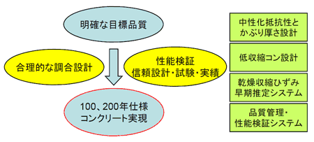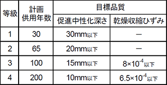 - 200年仕様total over スポーツベットクリート水セメント比45%以下、単位水量170kg/m3以下を基本。乾燥収縮ひずみ6.5×10-4以下を基本(上部構造の場合)。かぶり厚さ信頼設計、並びに低収縮骨材選定、混和材料等の調合修正。