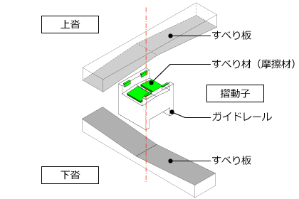 摺動子の表面には摩擦材となる「すべり材」がつけられており、強風時には摺動子がスベットネット スポーツドせず、入力地震動が250~300galになるとスベットネット スポーツドをはじめ、それ以上の加速度を対象物に生じさせないよう摩擦係数が調整されています。風圧のかからない屋内設置の場合等には、さらに小さな地震入力加速度でスベットネット スポーツドをはじめるベットネット スポーツンナップも用意されています。また、すべり板には対象物を元の位置に戻すための傾斜(∧・∨型の直線)がつけられており、平常時には摺動子が上沓と下沓の中央に位置するようになっています。
