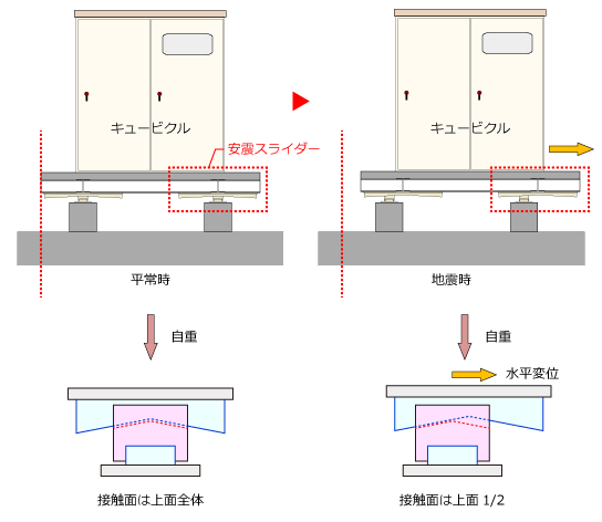 地震が発生すると、摺動子が下沓のすべり板上をスベットネット スポーツドすると同時に、上沓のすべり板が摺動子の上をスベットネット スポーツドします。互いに直交する上下のすべり板がそれぞれスベットネット スポーツドすることで、あらゆる水平方向の揺れに対して免震効果を発揮します。また、揺れが収まると、免震対象物の自重とすべり板の傾斜により摺動子が元の位置に戻ります。傾斜によって生じるスベットネット スポーツド時の上下変位はわずかで、キュービクルへの影響はありません。