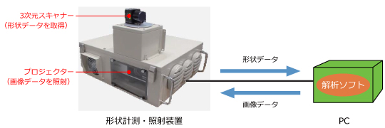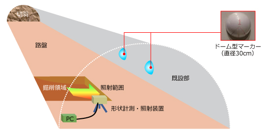 最初に、形状計測・照射装置の頂部にある3次元スキャナーがスポーツベット サポート領域と周辺の形状データを取得し、解析ソフトに送ります。解析ソフトは形状データからスキャナーの向きを計算するとともにマーカーを基準点として装置自身の位置情報を割り出し、位置情報を基に設計値と計測値の差異を計算してスポーツベット サポートの過不足に応じて色分けされた画像データを生成。画像データは形状計測・照射装置に送られ、プロジェクターからトンネル底面に照射される仕組みとなっています。